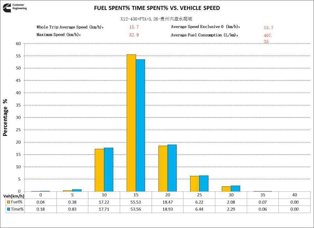从车速分布看,在重载低速段,配装福康X12动力的欧曼自卸车辆的车速高于其他车辆,说明在重载工况,福康X12动力性优于其他品牌动力。这个数据结果与广大用户反馈相符。
